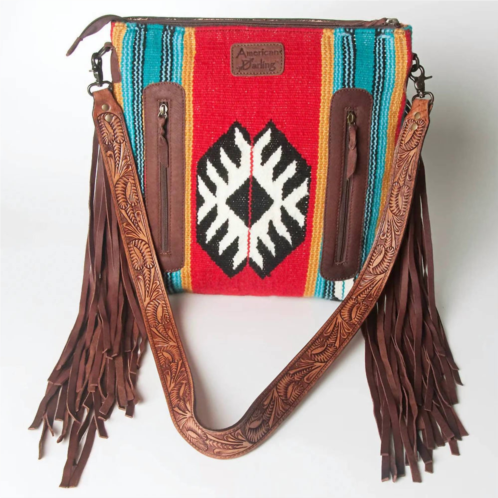 The crossbody bag is a trend that is here to stay and we especially love this style.Introducing the Women's Crossbody Messenger Bag by American Darling, an exquisite accessory in Brown Multi designed for style and functionality. Crafted from detailed hand-tooled and antique finished vegetable tanned American Cowhide Leather, this bag features a meticulously hand-woven wool saddle blanket for an elegant western look. The genuine full-grain leather ages beautifully and is accentuated with leather fringes, while the adjustable shoulder strap ensures comfort. With reliable YKK brand zipper closures for security, the bag measures 16 inches in height and 15 inches in width, offering ample space for essentials.