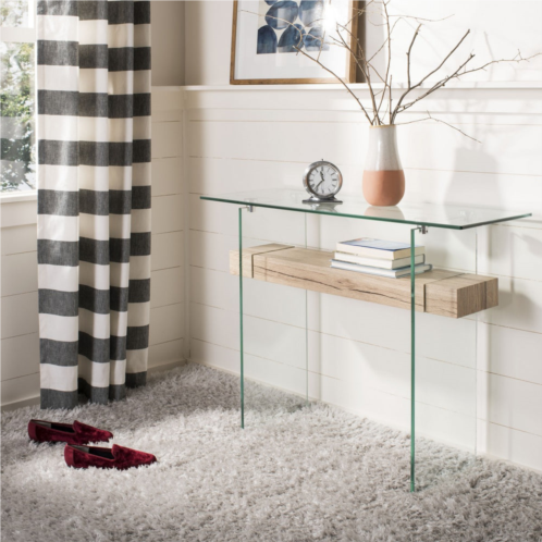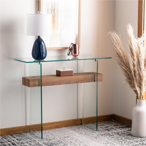 The Epitome Of Elegance, This Modern Glass Console Table Was Inspired By Treasures In London’S Design Museum. Ideal For The Living Room, Hall, Or Foyer, Its Chic Geometric Lines Were Designed With A Walnut Paper Finish And Transparent Glass.