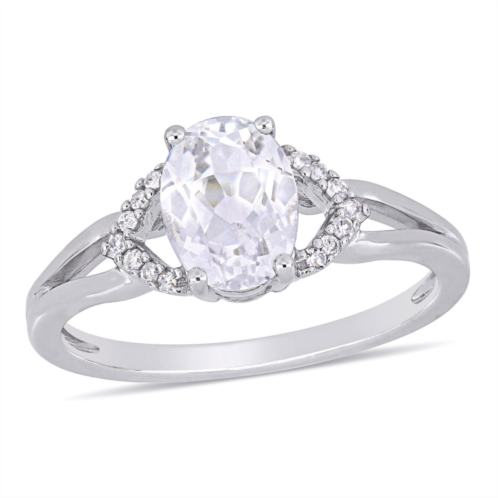 Engage your love with this luxurious Mimi & Max Created White Sapphire and Diamond-Accent Split Shank Engagement Ring. Mounted in gleaming white gold, this exquisite ring showcases an oval-cut, prong-set created white sapphire gemstone (8 x 6mm) enhanced by 14 round-cut, buttercup-set sparkling diamonds (G-H, I2-I3) in a split shank formation. This simple yet elegant ring is just what you have been looking for your special day to make it memorable one. This classic created white sapphire and diamond ring will surely make a valuable addition to any jewelry collection.