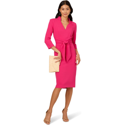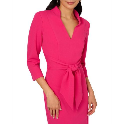 - A testament to refined style, sheath dress is a tailored look. Crafted from luxurious knit crepe fabric, this dress features a flattering V-neckline with a chic stand collar. The three-quarter sleeves and self-tie detail at the front add a touch of versatility and charm, while princess seams ensure a flattering fit. Complete with a back slit and discreet zipper at the center back, it offers both style and comfort for any occasion. Embrace timeless elegance with this essential piece that effortlessly transitions from day to evening with grace.