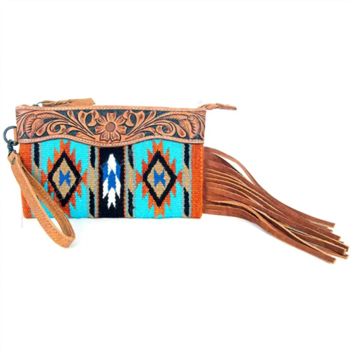 Lipstick, check. Mints, check. Credit card, check. The cutest little bag that holds all of your necessities.Introducing the Women's El Paso Wristlet by American Darling, a vibrant accessory that effortlessly combines style and functionality. This piece showcases a brightly colored wool saddle blanket look with a tooled floral top and popular fringe detailing. It features a practical wristlet loop and a secure zippered closure. Measuring 11'x6', this wristlet is perfect for carrying your essentials in an eye-catching blue multi hue.
