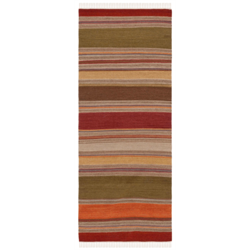 From California to Santa Fe, the rustic-chic look assumes a southwestern vibe with intricate warm, multi-colored stripes and a kilim flat weave reminiscent of traditional rugs.Woven of pure wool, this collection complements any room looking for a fresh update. Rug has an approximate thickness of 0.25 inches.