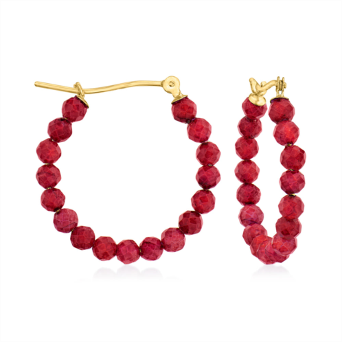 GENUINE 10KT GOLD 6.25 ct. t.w. ruby bead hoop earrings in 10kt yellow gold. 3-4mm round faceted ruby beads. 1/8 in. wide. Hanging length is 7/8 in. Snap-bar backings.