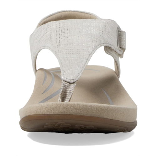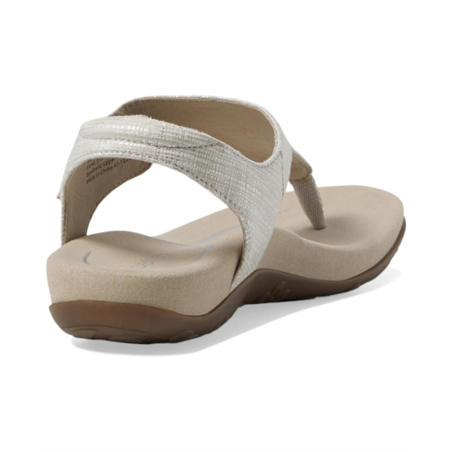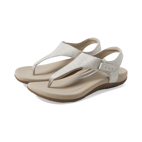 The Aetrex Ellie thong style sandals feature arch support that helps to stabilize and align feet, memory foam midsole, adjustable ankle strap buckle, and hook-and-loop closure. It has a faux leather upper.