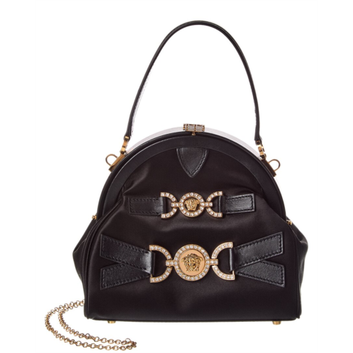 Indulge in the luxury and glamour of Versace with the Medusa 95 Satin & Leather Shoulder Bag. This exquisite handbag is made in Italy and features a stunning black satin and leather design with gold-tone hardware and embellished Medusa head logo accents. The interior is lined with luxurious satin and includes a convenient wall pocket. Measuring 8 inches wide by 7.5 inches high and 3.75 inches deep, this shoulder bag is the perfect size for all your essentials. The top handle has a 6 inch drop, and the bag opens with a framed kisslock closure. Protective feet at the bottom ensure that this bag stays in pristine condition. Please note that all measurements are approximate and slight variations may occur. Rest assured, all of our products are 100% genuine, sourced from trusted independent suppliers. Elevate your style with the bold, sexy, and glamorous aesthetic of Versace.