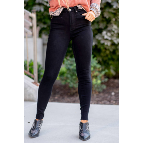 High-waist is here to stay and we especially love this style.Elevate your style with the Tummy Control Skinny Jeans from Judy Blue, delivering both comfort and chic design in a solid black shade. Crafted from a cotton blend, these high-rise jeans feature a slim fit with a skinny leg cut, enhanced by a button closure for a secure fit. Intent on flattering your silhouette, the high 11' rise and 28.5' inseam ensure a sleek appearance. Perfect for vacation and streetwear trends, this dark wash denim pairs with any spring wardrobe essentials.
