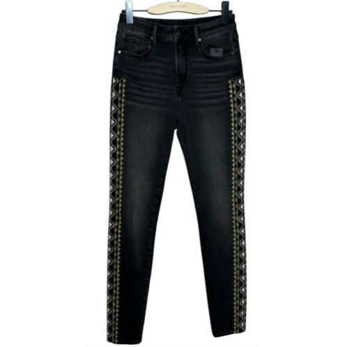 The perfect skinny jeans to wear with your favorite boots this season!Discover the Jackie Wave Jean by DRIFTWOOD in a chic New Wave black wash, featuring an eye-catching black and gold Aztec embroidered design along the side seam. Crafted from a cotton blend, these jeans offer a relaxed fit through a skinny leg silhouette, perfect for adding a touch of flair to your wardrobe. Composition comprises 93% Cotton, 5% Polyester, and 2% Spandex. With a mid-rise waist and practical button closure, these jeans are as functional as they are stylish. Care for them with machine wash and tumble dry instructions, and note that they offer an inseam of 27 inches with convenient pockets for added utility.
