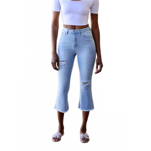 We especially love this cropped jean with a cute pair of slides or sandals.Discover effortless style with the YMI Tenielle High-Rise Flare Ankle Flood Jeans. Crafted from a cotton blend, these blue textured jeans feature a high-rise fit with a five-pocket construction and a single button closure with a front zip. The frayed edge at the hem and destruction details add a trendy streetwear flair, perfect for summer music festivals. Measurements for size 5 include a 25' inseam, 11' rise, and 19' leg opening. Care - Machine wash cold for easy maintenance.