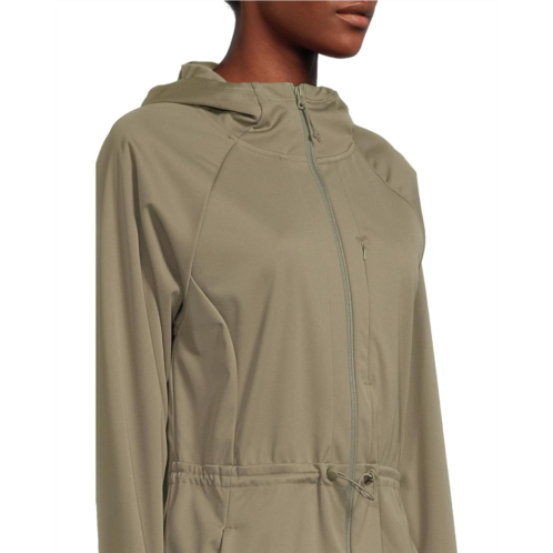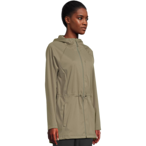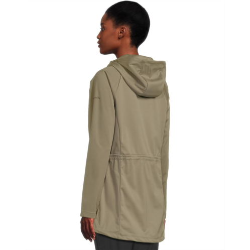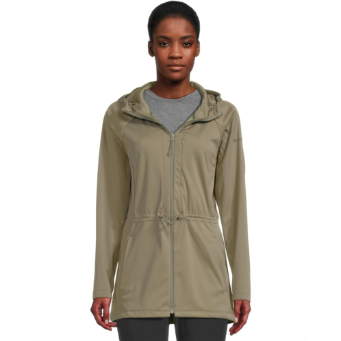 - The Columbia Flora Park II Softshell Jacket features Omni-Wind Block technology that repels wind and rain to keep you comfortable and dry in damp or windy weather. The drawcord-adjustable waist of the jacket provides a versatile fit, while the Omni-Shield fabric repels moisture and resists stains, keeping you clean and dry in messy conditions. This softshell jacket is styled with long sleeves, a drawcord adjustable hood, and a droptail hem. Offering light warmth, this zip-up jacket has two zippered hand pockets and a zippered chest pocket that keep your valuables secure.