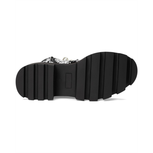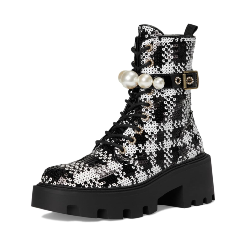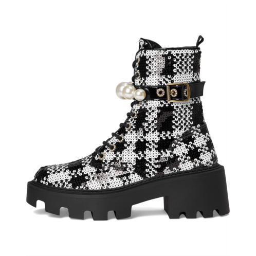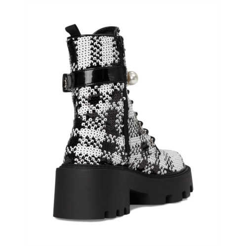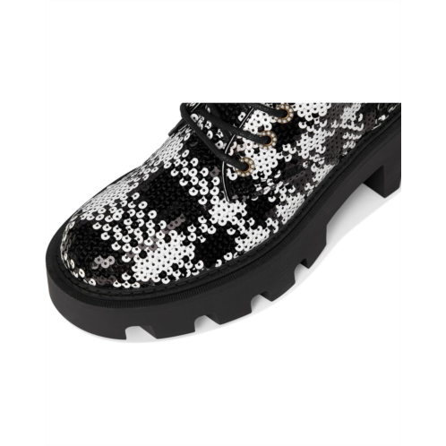 The Blue by Betsey Johnson Jonnie Combat Boot is cool girl approved , with its lug soles and feminine pearl embellishment with side buckle details. The ankle-high boots are crafted with a sequin polyester fabric upper, a polyester lining, and a polyurethane insole. The solid block heel elevates the height and the lace-up design with closure ensures easy on/off.