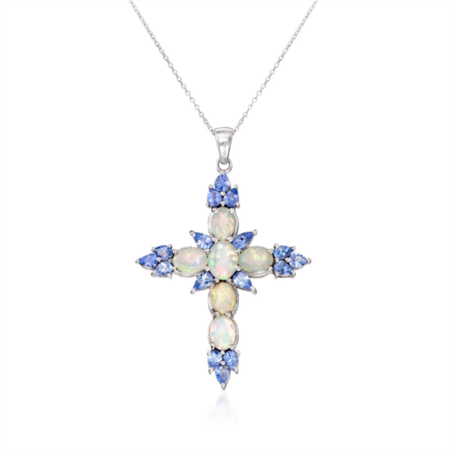 With a commitment to quality and affordability, Ross-Simons presents timeless jewelry for the modern woman. Faith shows its true colors in this vibrant cross pendant necklace. The traditional symbol elegantly takes shape with six 7x5-8x6mm oval Ethiopian opals and 1.90 ct. t.w. pear-shaped tanzanites. Crafted in sterling silver. Suspends from a cable chain. Springring clasp, tanzanite and opal cross pendant necklace. Necklace drop length - 2 inches long. Necklace drop width - 1 3/8 inches wide. Each Ross-Simons item arrives in a fine jewelry presentation box. Shop Ross-Simons jewelry risk-free as all items include a 30-day, 100% money-back guarantee.