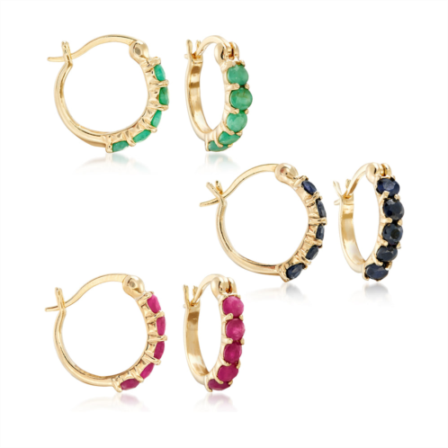 A top-rated jeweler since 1952, Ross-Simons travels the world to find high-quality styles at the best prices. The must-have set for every jewelry collection. Three pairs of huggie hoop earrings feature 2.60 ct. tot. gem wt. ruby, emerald and sapphire gemstones in 18kt yellow gold over sterling silver. Hanging length is 1/2'. Snap-bar, three-pair gemstone huggie hoop earring set. Each Ross-Simons item arrives in a fine jewelry presentation box. Shop Ross-Simons jewelry risk-free as all items include a 30-day, 100% money-back guarantee.