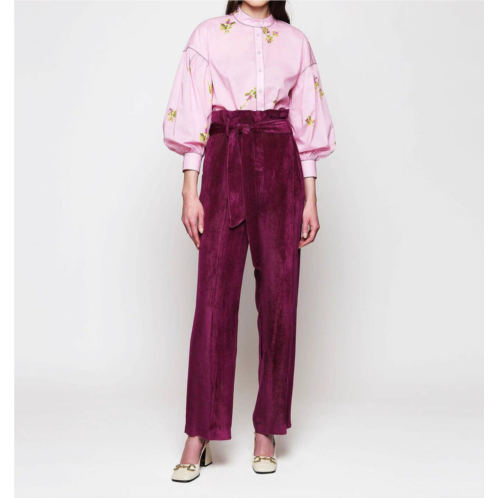 Fluid velvet corduroy trousers. High rise waist with pleats & tie up belt in same fabric. 100 % Viscose. WASHING INSTRUCTIONS - Wash max.30 ºC on a delicate program. Do not use bleach. Do not use a tumble dryer. Do not use bleach. Iron max.110ºC