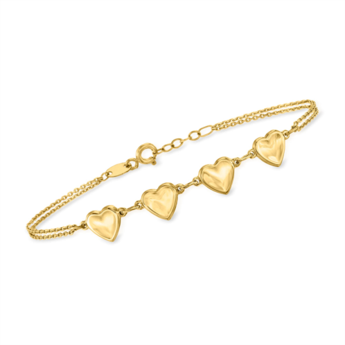 At Ross-Simons, we recognize the style power of versatile classics.RS Pure. Modern designs that complete your outfit and complement your personality.Add some love to your stack with this dainty bracelet. The small hearts are stationed at the center of the double cable chains. Includes a 1/2' extender. Springring clasp, 14kt yellow gold heart station bracelet. Each Ross-Simons item arrives in a fine jewelry presentation box. Shop Ross-Simons jewelry risk-free as all items include a 30-day, 100% money-back guarantee.