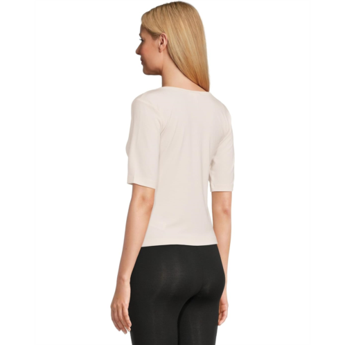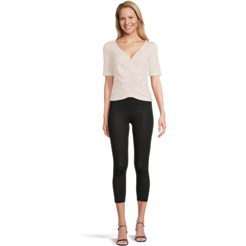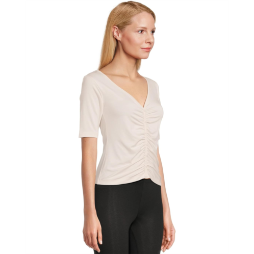 - The Splendid Yasmina Ruched Tee beautifully blends timeless elegance with modern comfort. The pull-on style top features short sleeves with round-cut cuffs and shirring at center front to create a V-neckline. The center-front button closure features decorative, non functional buttons.