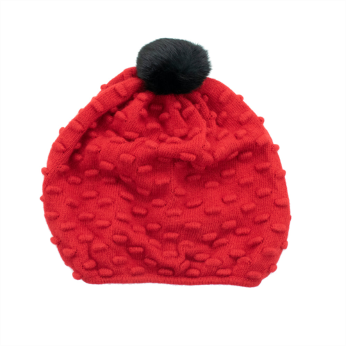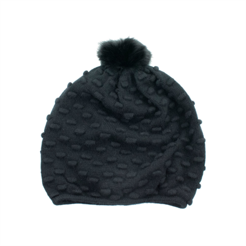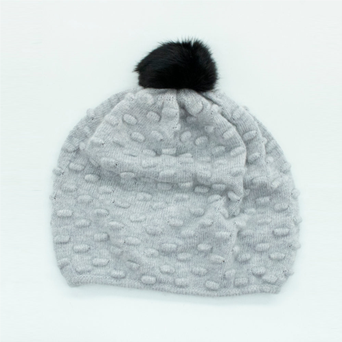 11' Ladies hat in all over popcorn bump stitch with rabbit fur pom on top- 40%POLYESTER,28% NYLON,17% WOOL,10% RABBIT HAIR,5% CASHMERE/ rabbit fur