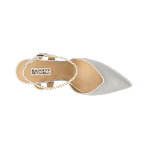 The Badgley Mischka Destinee is a chic pump featuring pearl detail on the ankle strap with adjustable buckle closure. With a pointy toe shape, the footwear has a flare heel and sleek low-top silhouette.