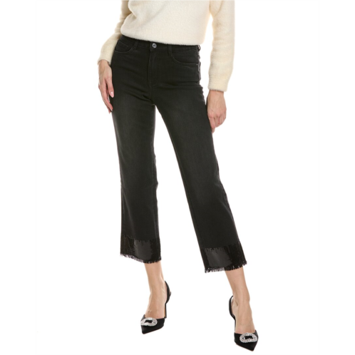 Elevate your casual wardrobe with the Joseph Ribkoff Straight Leg Jean. These stylish black jeans feature a straight leg fit with a trendy sequin fringe hem, adding a touch of glamour to your everyday look. Made with a blend of cotton, polyester, viscose, and spandex, these jeans are both comfortable and flattering. The classic five-pocket styling and belt loops offer a timeless silhouette, while the zip fly with button closure ensures a secure fit. Ideal for pairing with your favorite tops and sweaters, these versatile jeans are a must-have for any fashion-forward woman. Hand wash recommended. Made in imported. Model is 5'9 and is wearing a size 4. Inseam approximately 27in; 9.5in rise. Please note that measurements may vary slightly by size.