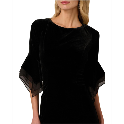 - Mixed fabrications make this timeless sheath dress extra special. This midi dress features a boat neckline, fitted silhouette through the body, and tiered three-quarter bell sleeves with organza accents. Crafted using soft, buttery velvet, this day dress has some stretch and no waist seam for a comfortable fit. A zipper back closure and a single pleat at the center back of the skirt hem completes the design. This velvet dress can be styled for the office or a cocktail party with a simple switch of accessories.