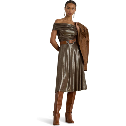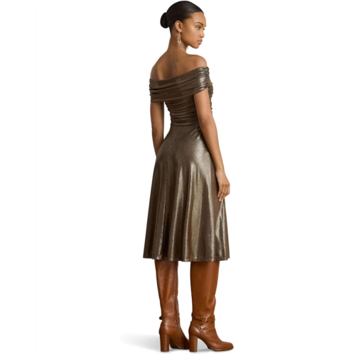 - Add a bit of sparkle and shine to your look wearing the Lauren Ralph Lauren Metallic Off-The-Shoulder Cocktail Dress. This cocktail dress pairs metallic foiled jersey with a ruched off-the-shoulder bodice and a flared skirt, making this style a striking choice for special occasions. It features a fit-and-flare silhouette, concealed left-side-seam zipper with a hook-and-eye closure, and short sleeves.