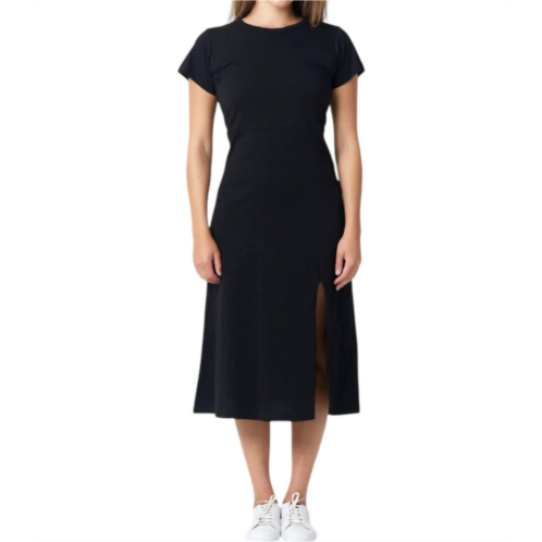 Just add slides or mules and you are good to go.Stunning black bodycon midi dress. Designed for an effortlessly chic look. Short sleeve and crew neckline. Crafted from 100% organic cotton slub. Offering a soft feel with just the right amount of stretch and breathability. Made in India. Closure is a convenient pull-on style. Easy yet sophisticated.