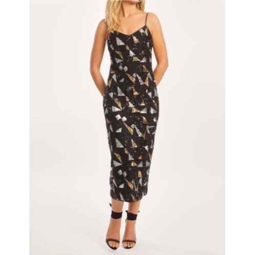 A midi dress so versatile, your options for wearing it are endless.A strapless design and adjustable spaghetti straps, this dress flaunts a sleek, fitted sheath silhouette in midi length, accentuated by a striking geometric gold and silver pattern. Composed of polyester with a glamorous sequin mesh fabric, it features a convenient zip closure for a seamless finish. Care for this stunning piece by hand washing to maintain its captivating allure.