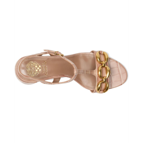 Chain link charm redefined in the Vince Camuto Chirie Chain Link Block Heel Sandals. Crafted from refined crocodile-embossed leather in a dreamy chai latte hue, this sandal radiates modern charm from every angle. The open-toe T-strap silhouette features a graceful ankle strap with a gold-tone buckle for a secure, customized fit, while the bold gold chain detail across the vamp adds eye-catching polish. A sturdy block heel offers wear-all-day comfort without compromising style.