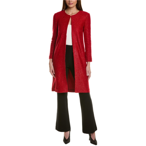 Elevate your outerwear collection with the St. John Sequin Coat in Ruby. This luxurious knitwear coat is effortlessly elegant and perfect for adding a touch of glamour to any ensemble. Measuring approximately 39 inches from shoulder to hem, this coat features a hook-and-eye closure for a secure fit. The blend of 62% rayon, 16% polyester, 14% polyamide, and 8% metallic adds a touch of shimmer to this stunning piece. Designed and made in the USA, this St. John coat is a timeless addition to your wardrobe. Whether you're heading out for a night on the town or simply running errands, this coat is sure to make a statement. Model is 5'10' and is wearing a size 4, but measurements may vary slightly by size. Dry clean only to keep this coat looking its best.