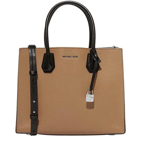 - Made of leather; Open top closure with letter detail on front; Middle zip compartment divides 2 large compartments