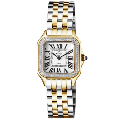GV2 12113B Women's Milan Diamond Swiss Quartz WatchGV2 Women's Swiss Watch from the Milan Collection27.5 mm Square IP Yellow Gold Case/Push Pull Crown with Blue Cabochon StoneDiamond Cut Bezel, Crisp White Dial with 12 DiamondsTwo-Toned SS IP Yellow Gold Bracelet with Deployment BuckleSapphire CrystalWater Resistant to 50 Meters/5ATMSwiss Quartz Movement Ronda 762