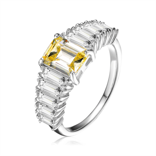 Be Unique and Fashionable When Wearing this Sterling Silver Yellow Cubic Zirconia Cluster Ring. This simple yet unique ring features a vertical cluster of clear baguette Cubic Zirconias and a vibrant yellow asscher Cubic Zirconia stone in the center. Crafted of Sterling Silver in Rhodium Plating and it is available in 6, 7, 8 size.