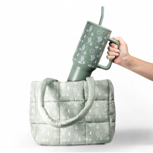 The perfect throw-it-in-and-go bag for your next weekend away or beach vacation! Its classic design will never go out of style and you'll be reaching for this bag season after season.The Cactus Puffer Bag is a spacious and stylish tote that seamlessly blends functionality with a trendy sage green aesthetic. Crafted from quilted polyester, this trendy cloud tote features a puffer design and a secure metal snap closure. Dimension - 11'x10'x4.7'.