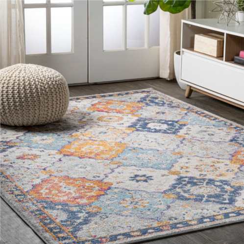 Layer on the cottage style with this colorful rug's all-over medallion design. The family-friendly pattern mixes navy and sky blue with a punch of orange for a vintage, Bohemian vibe. It's the perfect start to a vibrant color scheme in a bedroom, living room, entry, or dining area.