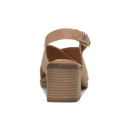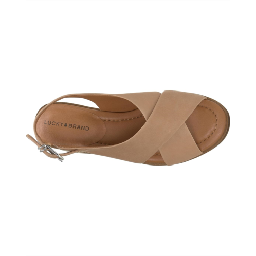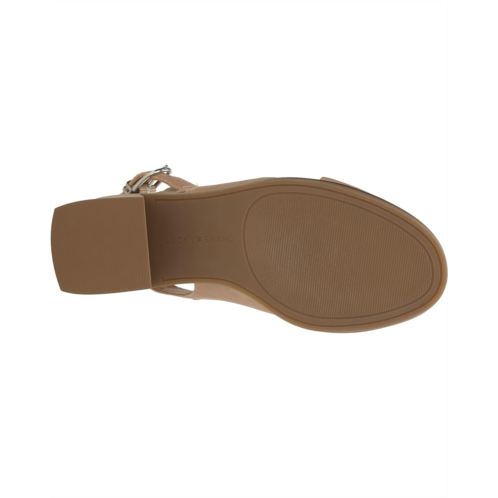 - Feel the extreme comfort wearing the Lucky Brand Rhidlee. Crafted from leather upper, synthetic lining, and polyester insole, it features crisscross vamp strap detailing, buckled closure, block heel, and round toe design.