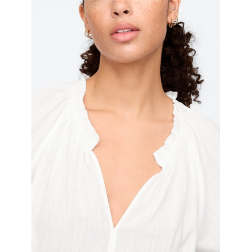 - Ruffle trim and shirring at split neckline.