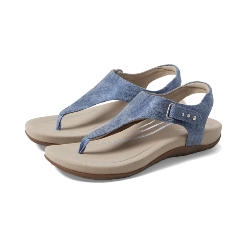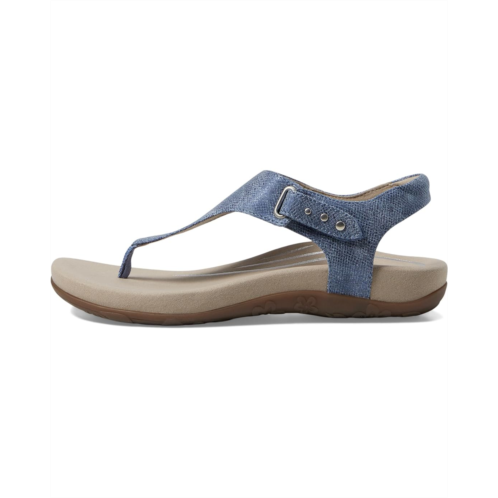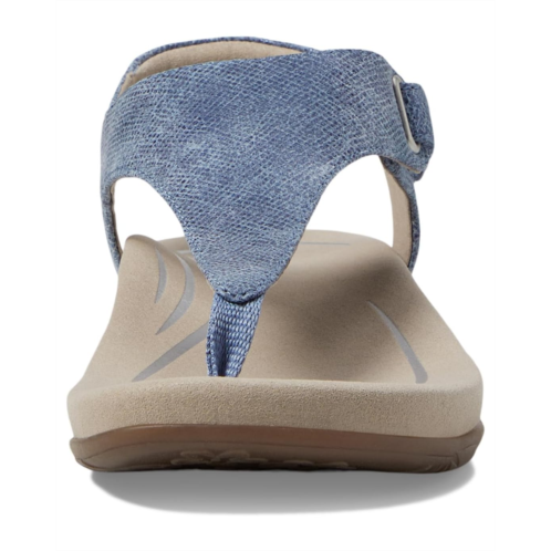 The Aetrex Ellie thong style sandals feature arch support that helps to stabilize and align feet, memory foam midsole, adjustable ankle strap buckle, and hook-and-loop closure. It has a faux leather upper.