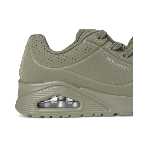 Step into the groove with the SKECHERS Uno - Shiny Scale shoes. These fashion sneakers feature a lace-up polyurethane reflective upper, Skechers Air-cooled Memory Foam insole, and a visible, air-infused Skech-Air midsole that gives you the feeling of walking on clouds, everywhere you go. The polyester lining offers added comfort. Experience cushioning and exceptional support with their signature comfort technology. Take to the air in a variety of lightweight styles and comfortable cushioning you can feel with these lace-up sneakers.
