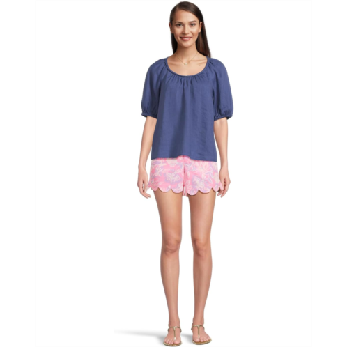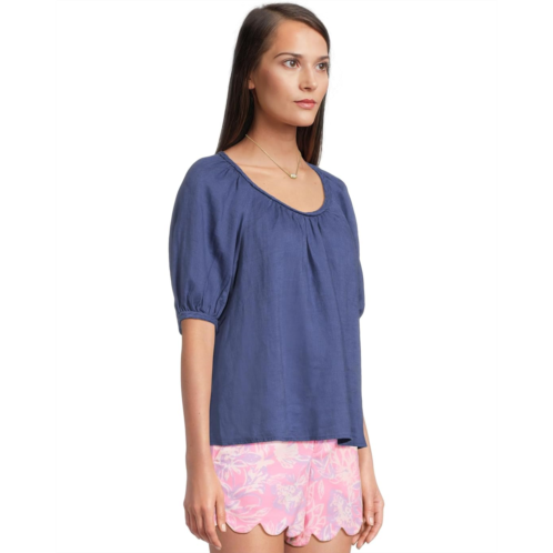 - The Lilly Pulitzer Calais Short Sleeve Top is a breezy, easy fit blouse crafted from linen for lightweight comfort. It features a round neckline with braid detailing and short puffy sleeves, creating a relaxed silhouette that skims the body without clinging.