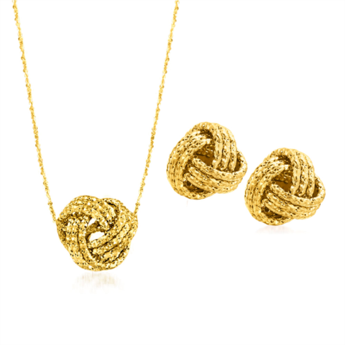 Established in 1952, Ross-Simons brings jewelry classics into the modern era. The symbol of eternal love is forever a favorite. This stunning necklace and stud earring set from Italy features gorgeous textured and polished 14kt yellow gold love knots for a romantic statement. Suspends from a criss-cross style chain with a springring clasp. Post/clutch. 14kt yellow gold love knot jewelry set. Necklace drop length - 3/8 inch long. Necklace drop width - 3/8 inch wide. Each Ross-Simons item arrives in a fine jewelry presentation box. Shop Ross-Simons jewelry risk-free as all items include a 30-day, 100% money-back guarantee.