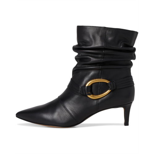 The Vince Camuto Kirpa Slouchy O-ring Bootsie is a perfect blend of effortless style and sophistication. The relaxed silhouette, combined with a pointed toe and a sleek kitten heel, creates an elegant yet laid-back vibe. A statement gold-tone circular buckle detail on the side adds a touch of vintage charm, while the wrapped suede straps enhance its bohemian appeal. Ideal for pairing with jeans, skirts, or dresses, this versatile boot is a timeless addition to any fashion-forward wardrobe.