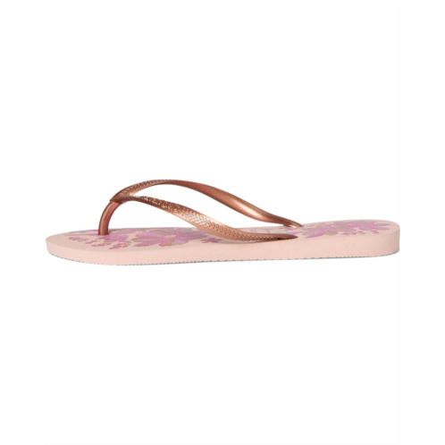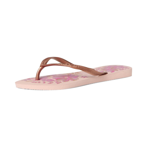 - Delicate and romantic, the Havaianas Slim Organic Flip Flop Sandals are one of Havaianas' most classic models. With thinner straps and rubber outsole, these sandals also feature a touch of sophistication with the metallic straps. Adorned with floral prints, the flip-flops are made of a rubber upper, insole, and lining. Whether you're going out to the beach or on a casual walk, these slip-on sandals are a great choice.