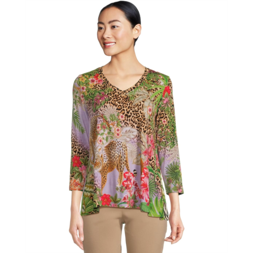 - The Johnny Was The Janie Favorite 3/4 Sleeve V-neck Swing Tee is a bold, statement-making piece that blends comfort with eye-catching style. Featuring a lush jungle-inspired print throughout, it's designed with a gentle V-shaped neckline and three-quarter length sleeves for a flattering silhouette. The soft, drapey fabric offers a relaxed yet polished feel.