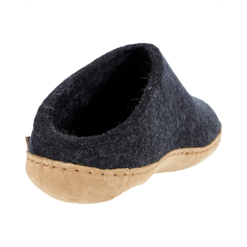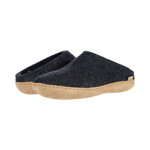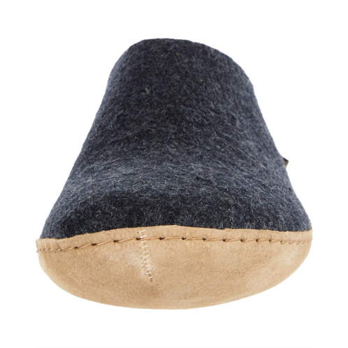 - Slip-on mule slipper has a soft wool upper and an open back for easy on/off.