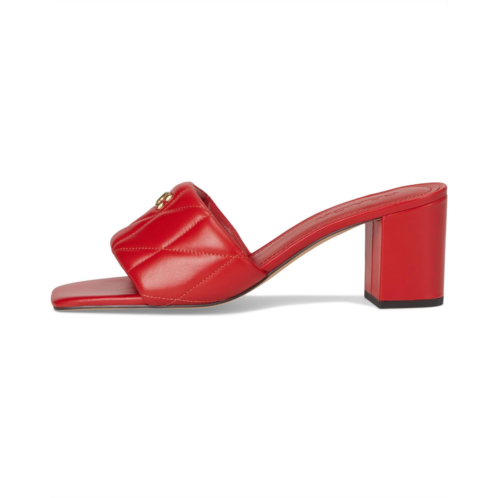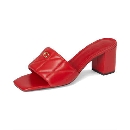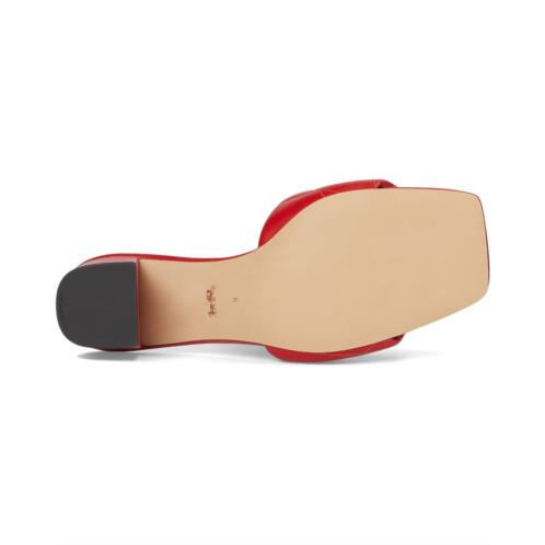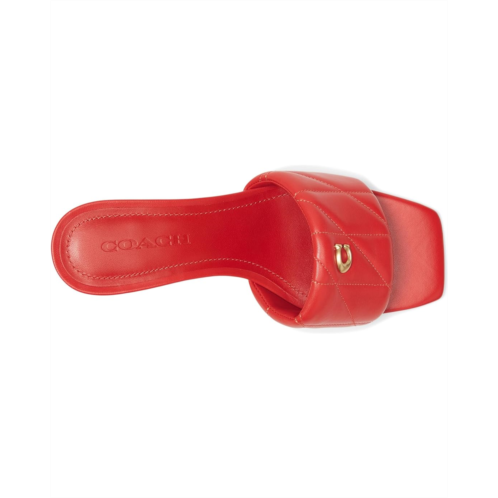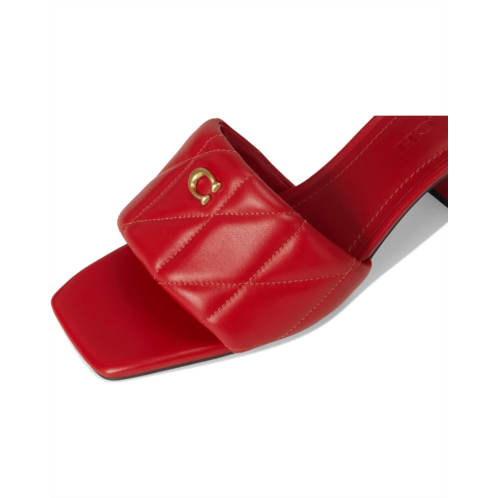 Strut in confidence wearing the COACH Holly Block Heel Sandals with Quilting. Crafted from leather upper, man-made leather lining, and leather insole, this pair of sandals features open square toe, quilted wide strap on the vamp with gold-tone logo emblem, slip-on style, block heel, and brand detailing on the footbed.