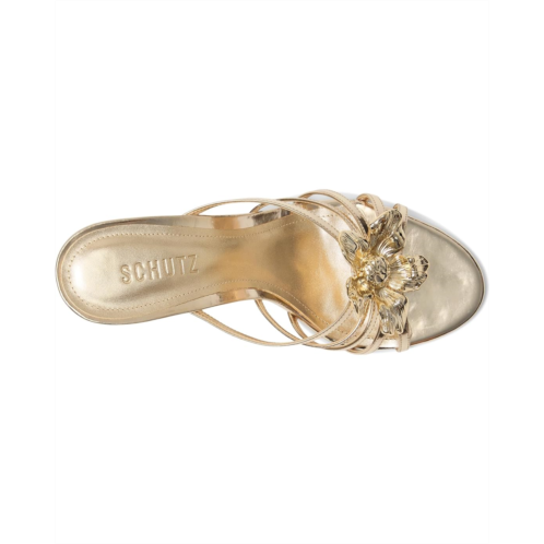- The Schutz Flora Mule is topped with a floral embellishment on the strappy front silhouette. This slip-on sandal features a leather upper, lining, and foam insole.