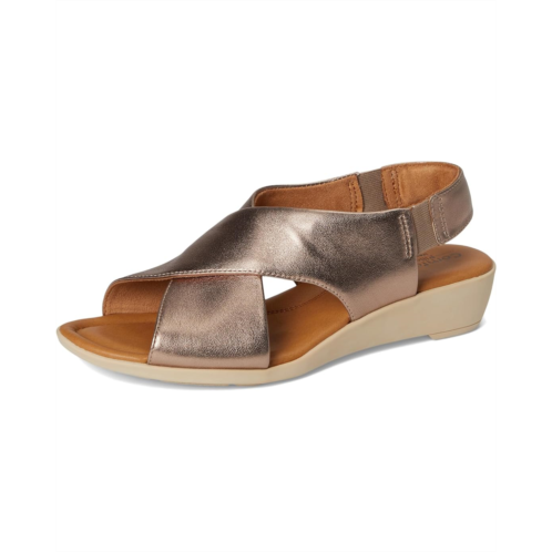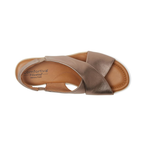 - The Comfortiva Emilee sandals are perfect to pair with different outfits and styles. These heeled sandals are made of a foam insole, microfiber cushioned sock, and faux suede lining. The leather upper is styled with a cross-band design and an elasticized gore sling for a better fit.