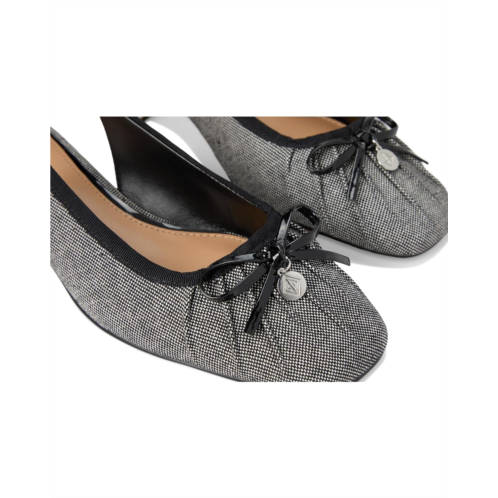 Move better and smarter wearing the Donald Pliner Darah. Crafted from ruched leather upper, lining, and insole, this pair of sandals features square toe, feminine bow and DP charm ornament, and block heel with electroplated detail.