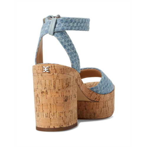 - Unleash your inner fashionista wearing the Sam Edelman Immie. It is crafted from fabric upper, synthetic lining, and polyurethane footbed. This pair of sandals features block heels, ankle strap bucked closure, round toe design, wide strap on the vamp, and brand detailing on the footbed.