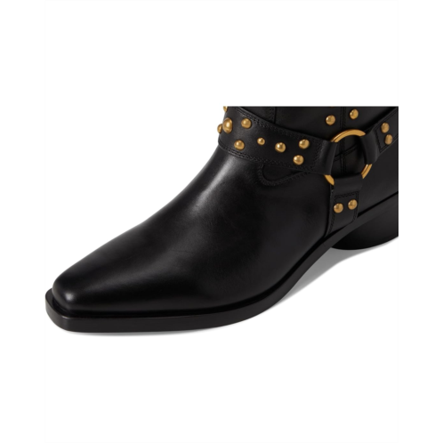 - The Vince Camuto Roista Motocycle Bootsie features a bold, edgy design with gold-toned stud detailing running vertically along the shaft. A sturdy, low block heel and a snip toe give them a sleek, modern silhouette. The standout feature is the wide strap with a large gold ring and matching studs, evoking a stylish biker or western-inspired aesthetic.