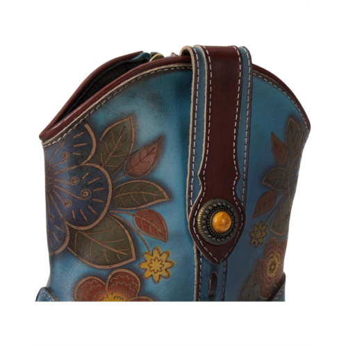 - Step into bold Western elegance with this stunning floral-embossed leather boot. Featuring a rich blend of hand-painted hues, intricate floral detailing, and classic cowboy-inspired stitching, this boot is the perfect mix of artistry and rugged charm. The pointed toe and faux stacked heel give it an authentic Western feel, while the side zipper ensures effortless wear. Designed for comfort with a cushioned insole, this boot is perfect for those who love to make a statement without compromising on wearability. Whether paired with denim or a flowy dress, this boot adds flair to any look.